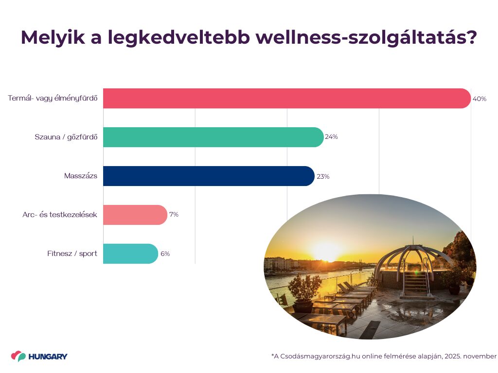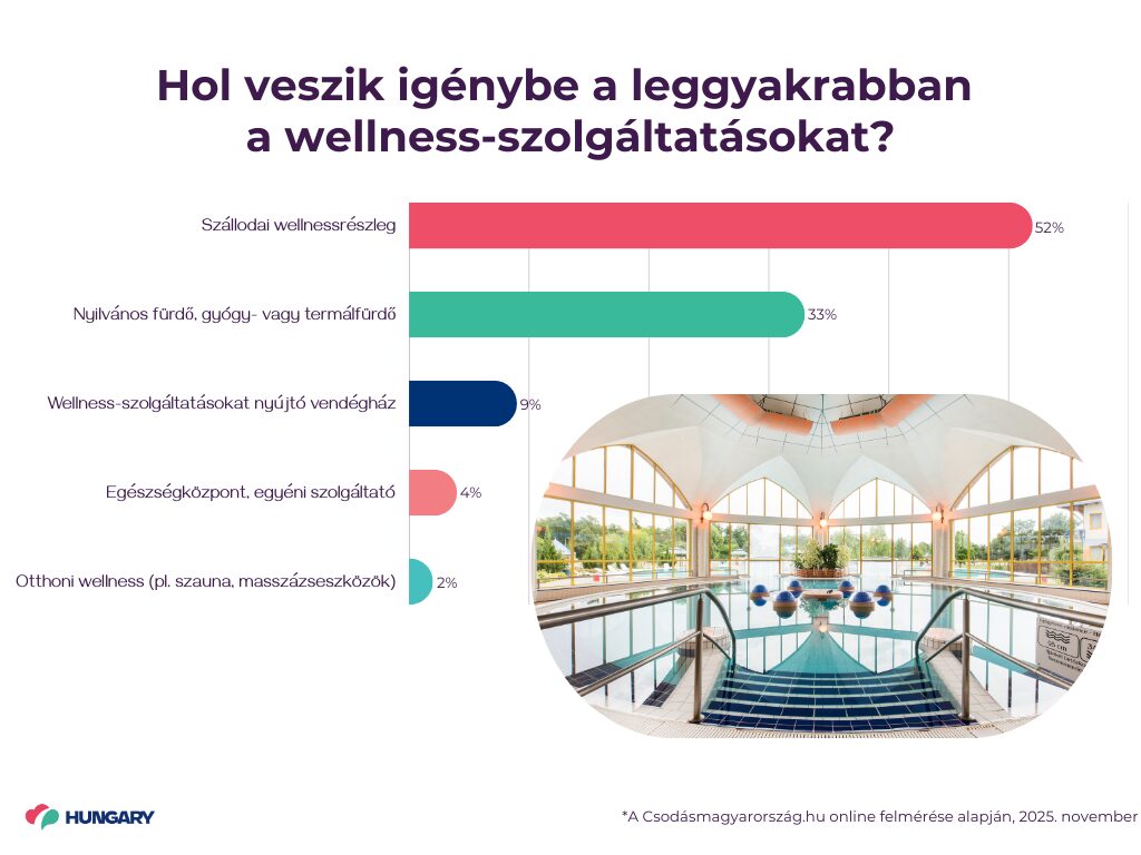 A válaszok alapján a szállodai wellnessrészlegek a legnépszerűbbek, ezeket a kitöltők 52 százaléka választja pihenés céljából. A nyilvános fürdők – legyen szó gyógy-, termál- vagy élményfürdőkről – a résztvevők egyharmada (33 százalék) számára jelentenek vonzó alternatívát. Wellness-szolgáltatást kínáló vendégházakba 9 százalék látogat, míg egészségközpontokat vagy egyéni szolgáltatók által működtetett részlegeket 4 százalék keres fel. Az otthoni wellnessmegoldások ezzel szemben csupán a válaszadók 2 százalékára jellemzők.
