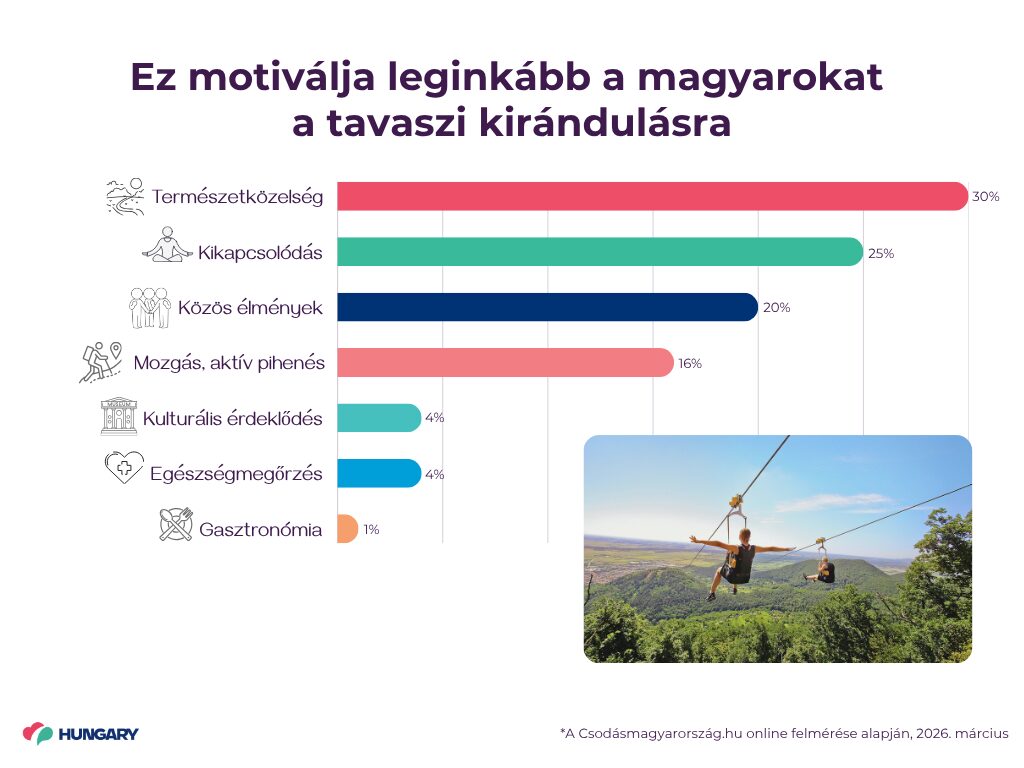 A tavaszi kirándulások legfőbb vonzereje egyértelműen az éledő természet: a válaszadók 30 százaléka ezt nevezte meg elsődleges motivációként. A kikapcsolódás a megkérdezettek negyedét ösztönzi útnak indulásra, míg minden ötödik válaszadó a közös élmények miatt választja ezt a programot. Az aktív pihenés és mozgás a válaszadók 16 százaléka számára meghatározó, míg a kulturális érdeklődés és az egészségmegőrzés egyaránt 4–4 százalék esetében jelenik meg fő szempontként.