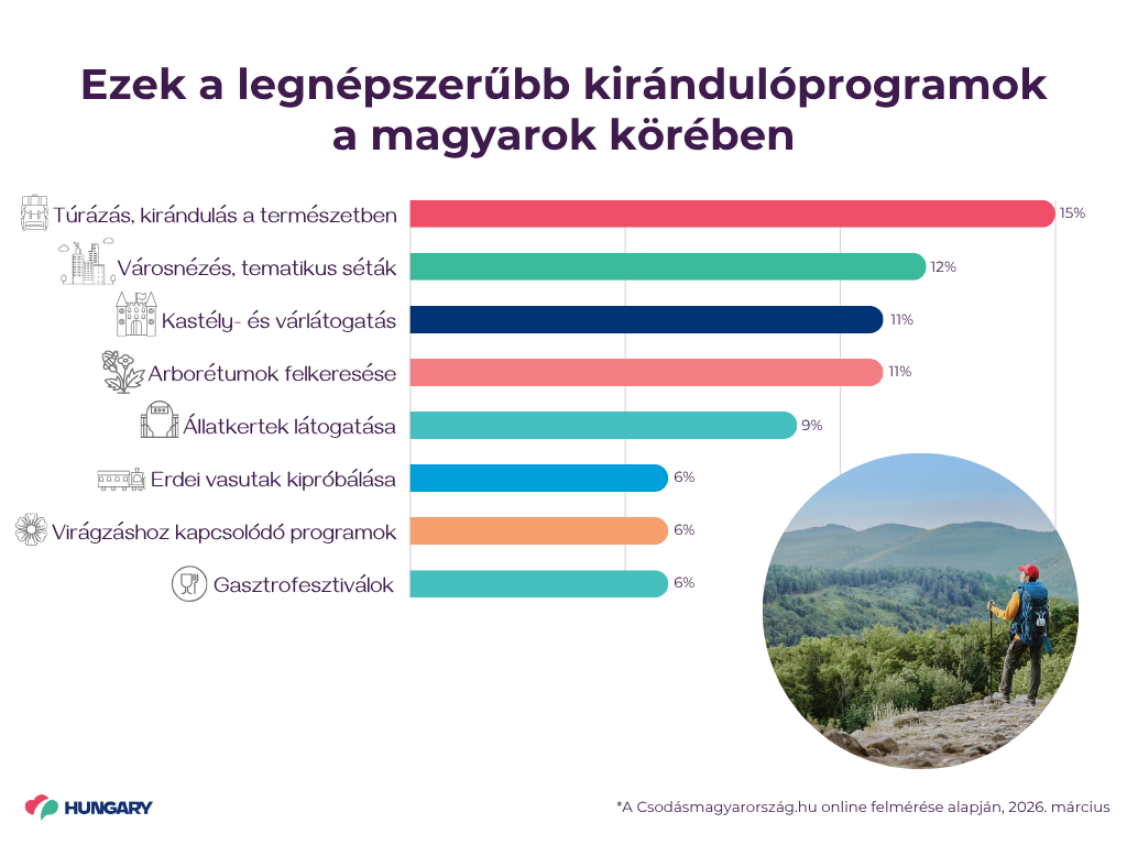 A magyarok közel fele havonta legalább egyszer kirándul tavasszal, és elsősorban a természet közelsége, a kikapcsolódás és a közös élmények miatt indul útnak –– derül ki a Csodásmagyarország.hu legfrissebb kutatásából. A legkedveltebb tavaszi program a túrázás és a városnézés, emellett a kastélyok, várak és botanikus kertek látogatása is kiemelt népszerűségnek örvend.